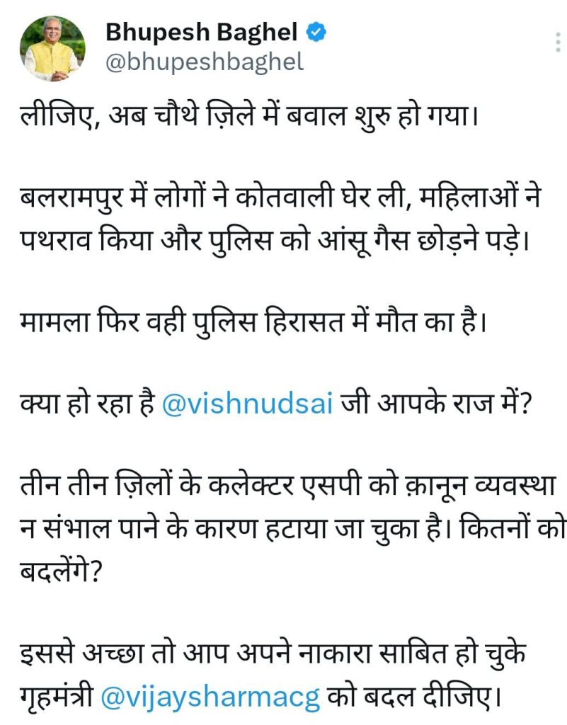 पूर्व मुख्यमंत्री भूपेश बघेल ने बीजेपी और सीएम विष्णु देव साय पर निशाना साधा है, उन्होंने अपने आधिकारिक सोशल मीडिया एक्स अकाऊंट पर लिखा कि, ”