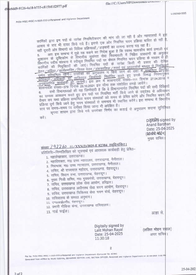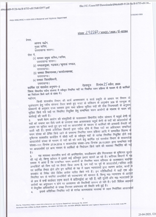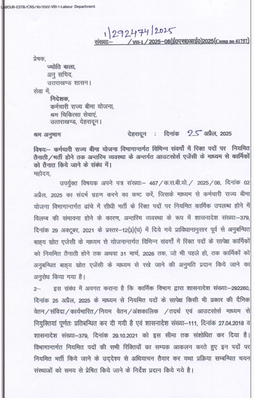 उत्तराखंड में विभिन्न विभागों में आउटसोर्स, संविदा और दैनिक वेतन से जुड़ी नियुक्ति पर पूरी तरह से रोक लगा दी गई है. मुख्य सचिव आनंद वर्धन ने एक बार फिर ऐसी नियुक्तियों पर पूरी तरह से रोक लगाने का आदेश जारी किया है. जारी आदेश के मुताबिक तमाम विभाग विभागीय संरचना में स्वीकृत नियमित पदों पर नियमित चयन प्रक्रिया के माध्यम से ही कर्मचारियों की तैनाती करने को कहा गया है. इसके लिए रिक्त पदों पर अधियाचन (डिमांड) भेजने के निर्देश भी दिए गए हैं.