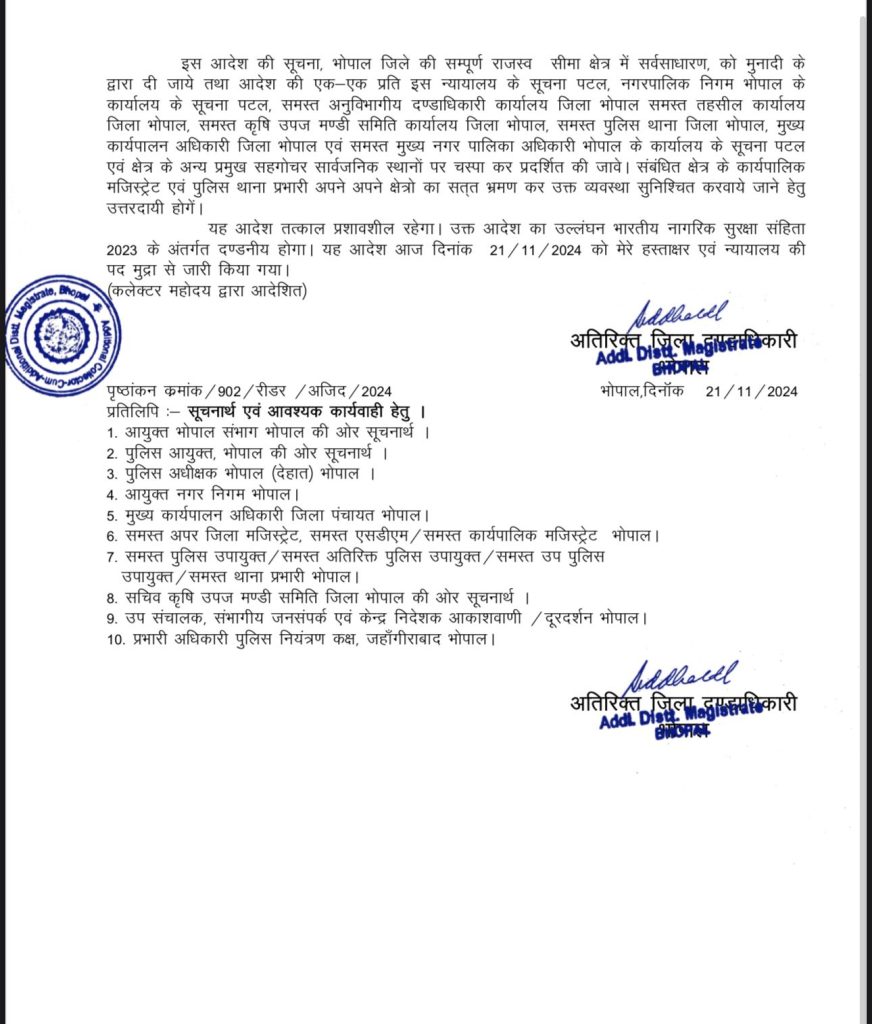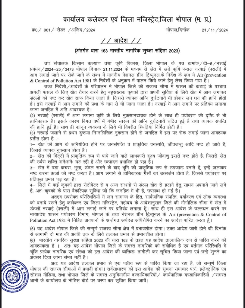 राकेश चतुर्वेदी, भोपाल। मध्य प्रदेश की राजधानी भोपाल में पराली जलाने पर रोक लगाई गई है। देर रात कलेक्टर कौशलेंद्र विक्रम सिंह ने आदेश जारी किया है। दो महीने के लिए पराली, यानी नरवाई जलाने पर प्रतिबंद लगाया गया है। आदेश का उल्लंघन करने पर एफआईआर दर्ज होगी।