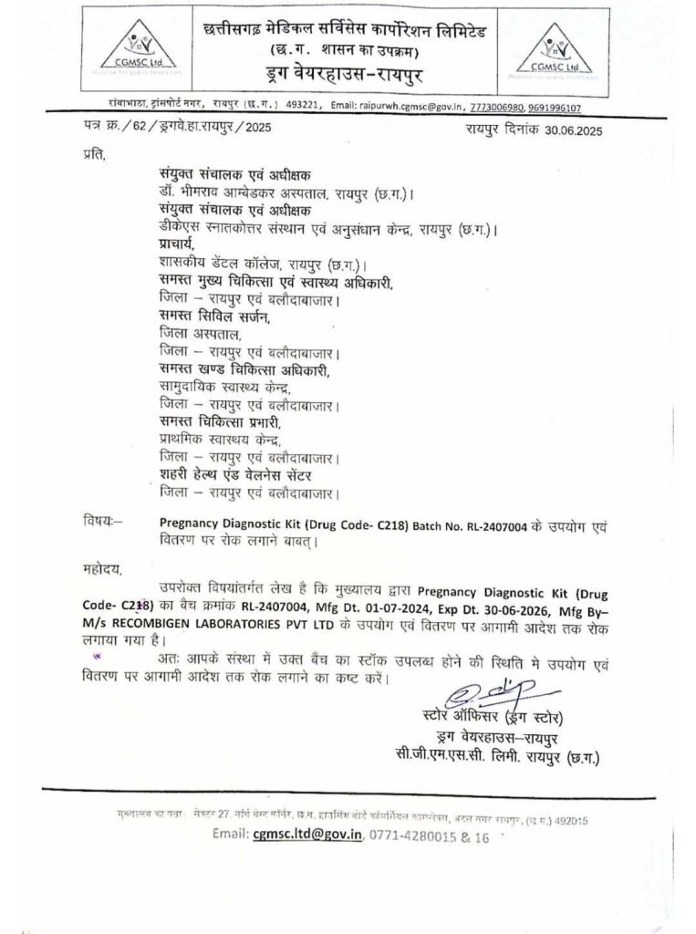 आदेश पत्र में लिखा है कि मुख्यालय द्वारा Pregnancy Diagnostic Kit (Drug Code- C218) के वैच क्रमांक RL-2407004, Mfg Dt. 01-07-2024, Exp Dt. 30-06-2026, Mfg By-M/s RECOMBIGEN LABORATORIES PVT LTD के उपयोग एवं वितरण पर आगामी आदेश तक रोक लगाया गया है. संस्था में उक्त बैंच का स्टॉक उपलब्ध होने की स्थिति में उपयोग एवं वितरण पर आगामी आदेश तक रोक लगाया जाए.