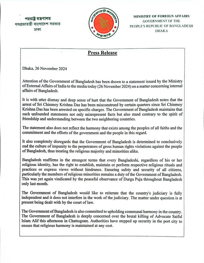 बांग्लादेश की अंतरिम सरकार ने लिखित रूप से कहा, “आज (26 नवंबर 2024) बांग्लादेश के आंतरिक मामलों से संबंधित एक मामले पर भारत के विदेश मंत्रालय द्वारा मीडिया को जारी एक बयान की ओर बांग्लादेश सरकार का ध्यान आकर्षित किया गया है.” बांग्लादेश सरकार का कहना है कि ऐसे निराधार बयान न केवल तथ्यों को गलत तरीके से पेश करते हैं, बल्कि दोनों पड़ोसी देशों के बीच मित्रता और समझ की भावना के विपरीत हैं, क्योंकि श्री चिन्मय कृष्ण दास को विशिष्ट आरोपों के तहत गिरफ्तार किया गया है.