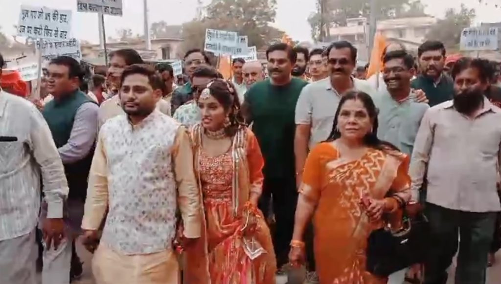 बुरहानपुर, मनीष जायसवाल। मध्य प्रदेश के बुरहानपुर में रैली में एक दूल्हा-दुल्हन आकर्षण का केंद्र रहे। इन दोनों की शादी शाम को होनी थी। लेकिन विवाह से पहले बांग्लादेश में सनातनियों पर हो रहे अत्याचार के विरोध में निकाली गई रैली में शामिल हुए। जिस-जिस ने रैली में जोड़े को देखा, वह हैरान रह गया। उन्होंने कहा, “बांग्लादेश में सनातन धर्म के मानने वाले हिंदुओं पर हो या अत्याचार के विरोध में रैली में शामिल होना हमारे लिए एक कर्तव्य की बात थी इसलिए हम यह रैली में शामिल हुए।”