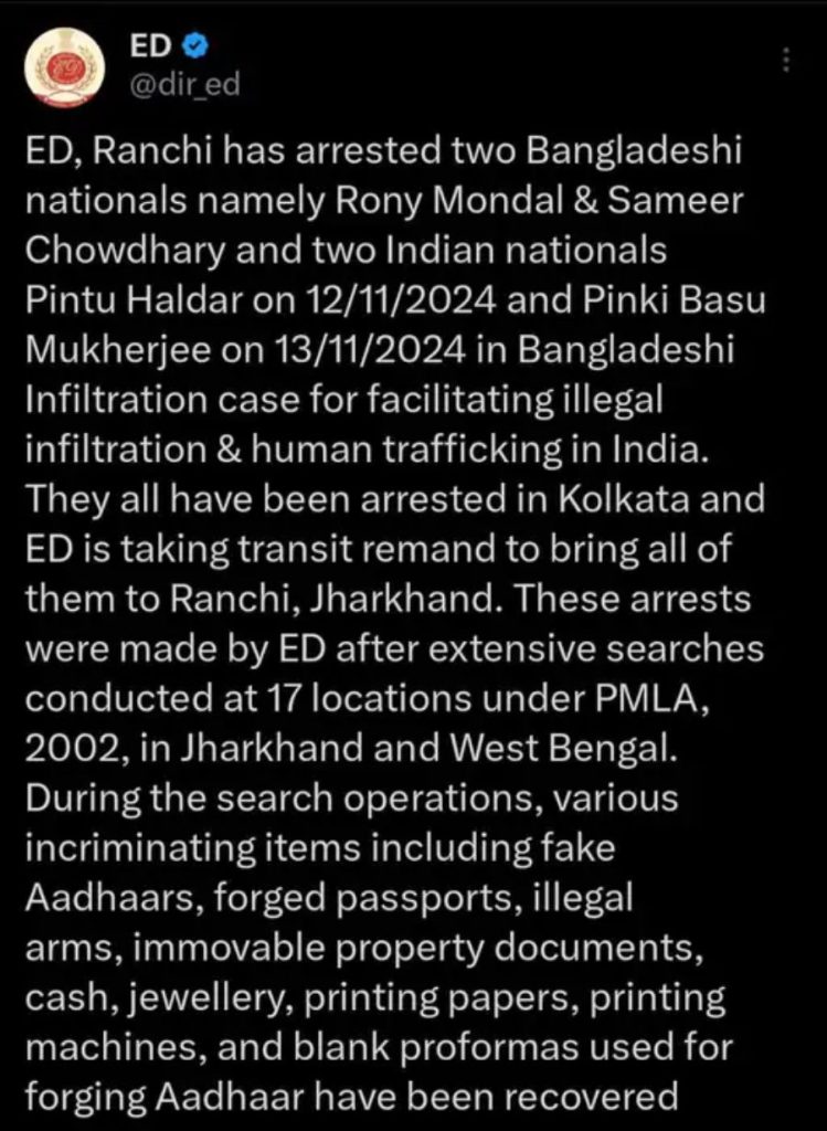 गौरतलब है कि ईडी ने रांची के बरियातू थाने में चार जून 2024 को कांड संख्या 188/2024 को धोखाधड़ी, जालसाजी व विदेशी अधिनियम के तहत दर्ज प्राथमिकी के आधार पर मनी लॉन्ड्रिंग के तहत केस किया था। उक्त प्राथमिकी फर्जी दस्तावेज के आधार पर भारत की सीमा में दाखिल होने से संबंधित थी। दर्ज प्राथमिकी में बरियातू थाने की पुलिस ने अपने थाना क्षेत्र के बाली रिसोर्ट से गिरफ्तार बांग्लादेशी लड़कियों को आरोपित बनाया था।इन लड़कियों में निपाह अख्तर खुशी, पायल दास उर्फ निम्पी बरूवा, अनिका दत्ता उर्फ शर्मिन अख्तर, हासी अख्तर उर्फ हासी विश्वास, प्रवीण व झुमा शामिल थीं। सभी का पता बांग्लादेश था। इन्हें मनीषा राय नाम की एक महिला एजेंट ने बाली रिसोर्ट में रखवाया था, जिसकी बरियातू थाने की पुलिस के साथ-साथ ईडी को भी तलाश है। बरियातू थाने में दर्ज उक्त प्राथमिकी की छानबीन के क्रम में ईडी बांग्लादेशी घुसपैठ में शामिल अन्य एजेंटों तक पहुंची थी।