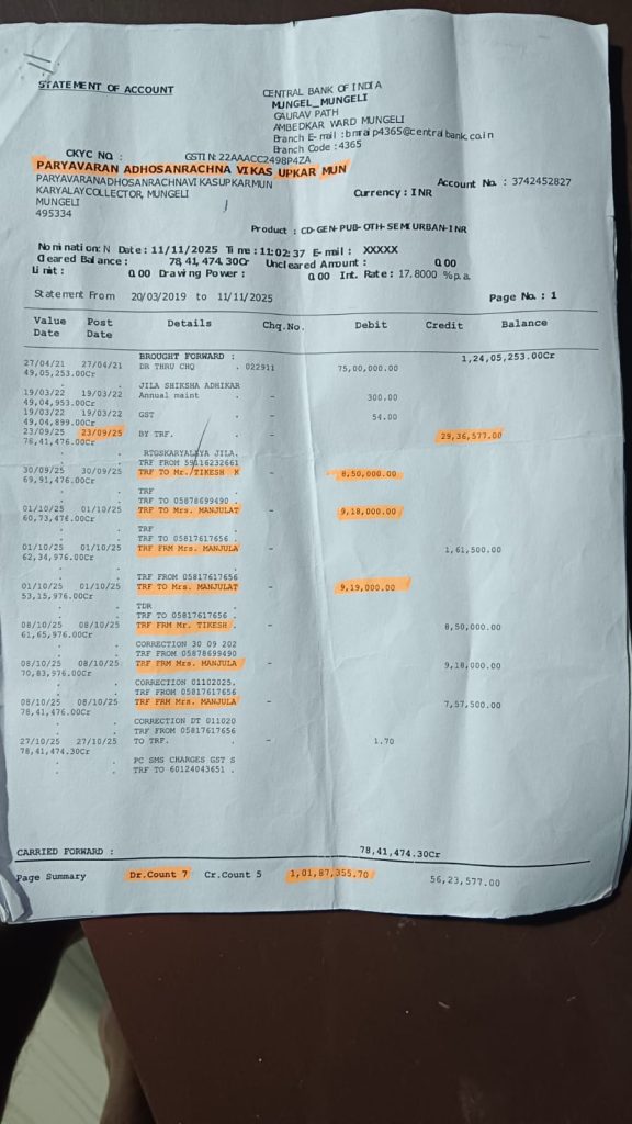 मुंगेली। छत्तीसगढ़ के मुंगेली जिले में सरकारी खजाने में सेंधमारी का एक बेहद गंभीर मामला सामने आया है. कलेक्ट्रेट के पर्यावरण अधोसंरचना विकास उपकर खाते से लगभग 26.87 लाख रुपये की हेराफेरी की गई है. इस खुलासे के बाद जिला प्रशासन और बैंक प्रबंधन के बीच हड़कंप मच गया है.
