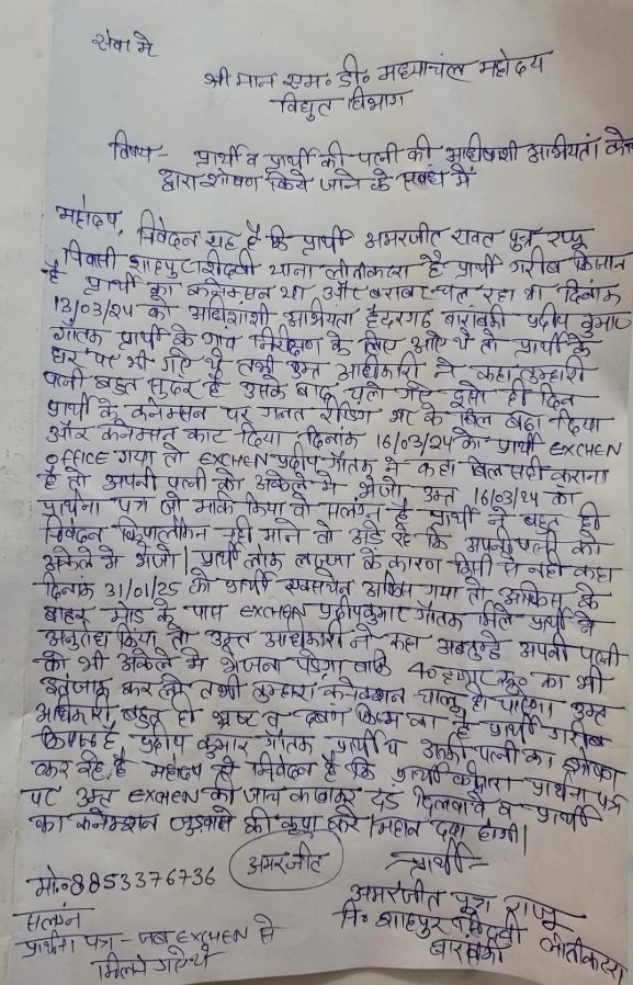 प्रार्थी की ओर से दिए गए शिकायत पत्र के मुताबिक, 13 मार्च 2024 को अधिशासी अभियंता प्रदीप कुमार निरीक्षण करने के लिए आए थे. वो प्रार्थी के घर पर भी गए. तभी उक्त अधिकारी ने कहा कि ‘तुम्हारी पत्नी बहुत सुंदर है’. जिसके बाद वह चला गया. अगले दिन गलत रीडिंग करके बिल बढ़ा दिया गया. जिसके बाद 16 मार्च 2024 को प्रार्थी ने इसकी शिकायत की. तब प्रदीप ने उसके सामने ऐसी गंदी शर्त रखी.