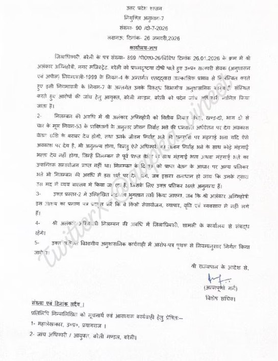 गौरतलब है कि बरेली नगर मजिस्ट्रेट अलंकार अग्निहोत्री ने सरकारी नीतियों विशेषकर UGC के नए नियमों और शंकराचार्य अविमुक्तेश्वरानंद से जुड़े मामले से राज थे। इसके बाद सोमवार गणतंत्र दिवस को उन्होंने अपने पद से इस्तीफा दे दिया था। अलंकार अग्निहोत्री ने सोमवार देर रात अपना सरकारी आवास भी खाली कर दिया। इससे पहले वे जिलाधिकारी अविनाश सिंह आवास पर मिलने पहुंचे थे। उन्होंने आरोप लगाया है कि जिला अधिकारी आवास पर उन्हें 45 मिनट तक बंधक बनाकर रखा गया।