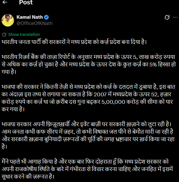 कमलनाथ X पर ट्वीट करते हुए लिखा कि भारतीय रिज़र्व बैंक की ताज़ा रिपोर्ट के अनुसार मध्य प्रदेश के ऊपर 5, लाख करोड़ रुपये से अधिक का कर्ज हो चुका है और मध्य प्रदेश के ऊपर देश के कुल कर्ज़ का 5% हिस्सा हो गया है। भाजपा की सरकार ने कितनी तेज़ी से मध्य प्रदेश को कर्ज़ के दलदल में डुबाया है, इस बात का अंदाज़ा इस तथ्य से लगाया जा सकता है कि 2007 में मध्यप्रदेश के ऊपर 52, हज़ार करोड़ रुपये का कर्ज़ था जो क़रीब दस गुना बढ़कर 5,00,000 करोड़ की सीमा को पार कर गया है।