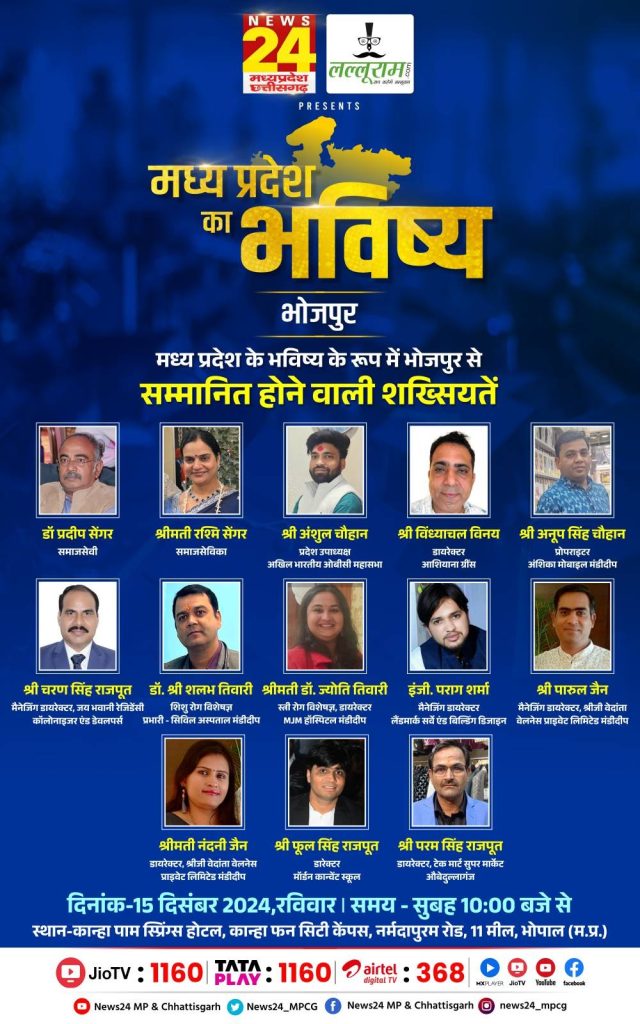 राकेश चतुर्वेदी, भोपाल। मध्य प्रदेश और छत्तीसगढ़ का सबसे भरोसेमंद चैनल न्यूज 24 मध्य प्रदेश-छत्तीसगढ़ (News24 MP-CG) और लल्लूराम डॉट कॉम (Lalluram.com) राजधानी भोपाल में 15 दिसंबर 2024 दिन रविवार को एक खास कार्यक्रम ‘मध्य प्रदेश का भविष्य भोजपुर’ का आयोजन करने जा रहा है। इसमें विशिष्ट अतिथि के तौर पर राज्यमंत्री नरेंद्र शिवाजी पटेल शामिल होंगे। वे दीप प्रज्वलित कर इस कार्यक्रम का शुभारंभ करेंगे। इस दौरान भोजपुर के विकास को लेकर मंथन का दौर चलेगा। वहीं भोजपुर में समाज सेवा, शिक्षा, मेडिकल और अन्य कार्य क्षेत्रों से जुड़े लोगों को सम्मानित भी किया जाएगा।