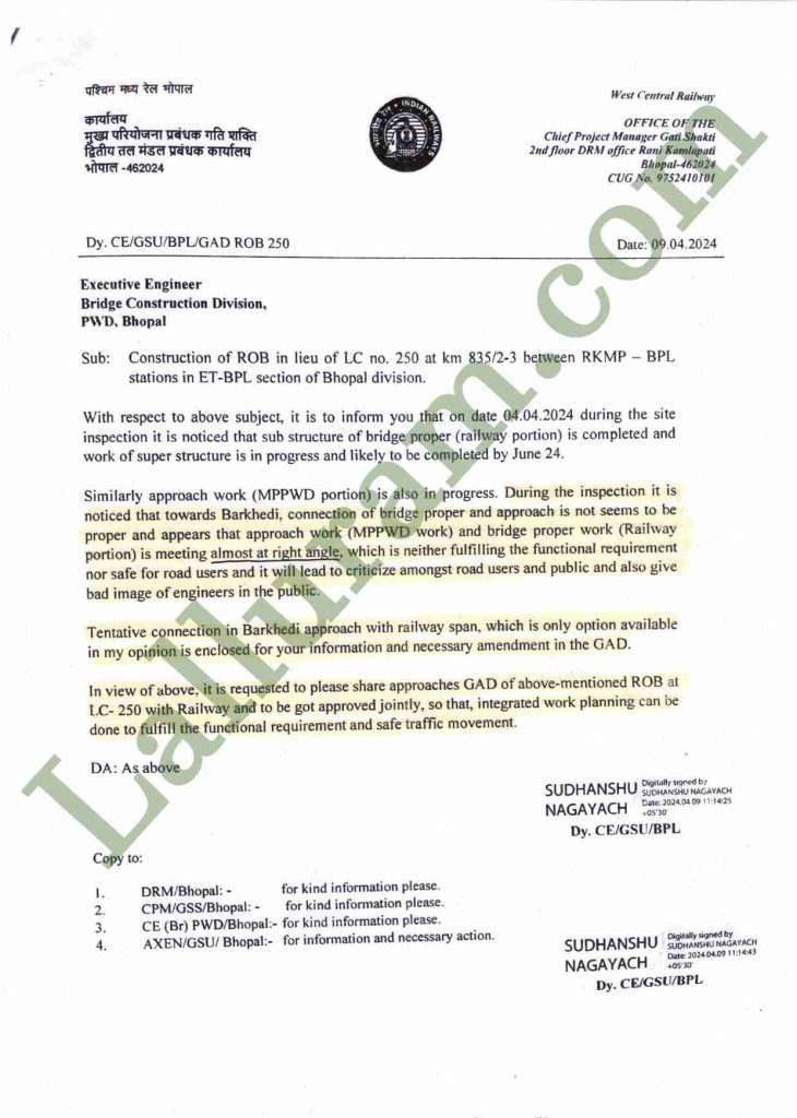 लल्लूराम डॉट कॉम (Lalluram.com) के हाथ वह पत्र लगा है जो रेलवे ने लोक निर्माण विभाग को लिखा गया था। जिसमें इस नायाब और अनोखे ब्रिज को बनाने पर आपत्ति जताई गई थी। पश्चिम मध्य रेलवे की ओर से भोपाल PWD के पुल निर्माण प्रभाग के एग्जीक्यूटिव इंजीनियर को 9 अप्रैल 2024 में यह लेटर लिखा गया था।