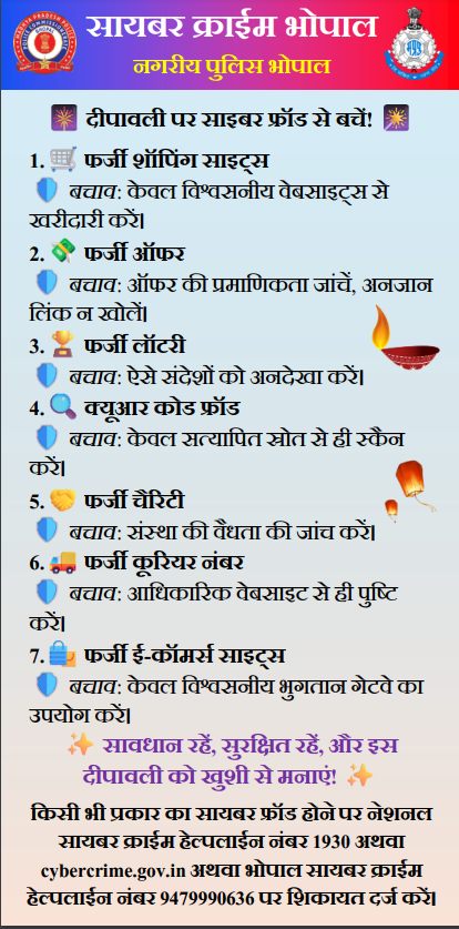 सावधान रहें, सुरक्षित रहें और इस दीपावली को खुशी से मनाएं! किसी भी प्रकार का सायबर फ्रॉड होने पर नेशनल सायबर क्राइम हेल्पलाइन नंबर 1930 और cybercrime.gov.in और भोपाल सायबर क्राइम हेल्पलाइन नंबर 9479990636 पर शिकायत दर्ज करें।