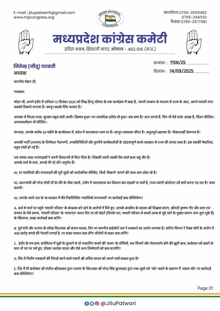 दरअसल मुख्यमंत्री डॉ मोहन के बयान पर जीतू पटवारी ने सवाल पूछे है। कहा- मछली और मगरमच्छ को ठिकाने लगाया है तो सूची दें। मछली परिवार को फर्श से अर्श तक पहुंचाने वाले सरकार के कैबिनेट मंत्री पर कब कार्रवाई होगी। मंत्री विश्वास सारंग, मंत्री कृष्णा गौर और सत्ता से जुड़े हुए लोगों ने मछली परिवार की मदद की है। विधायक संजय पाठक पर गंभीर आरोप लगे है पार्टी कब एक्शन लेगी?