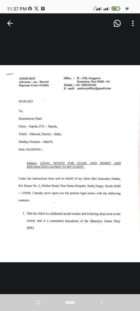 ड्रग्स मामले में सिहावल से बीजेपी विधायक के भतीजे जैनेंद्र पाठक ने पूर्व मंत्री कमलेश्वर पटेल को लीगल नोटिस भेजा है। कमलेश्वर पटेल ने जैनेंद्र पाठक के शारिक मछली के साथ बिजनेस करने का आरोप लगाया था। उन्होंने नोटिस में माफी मांगने की मांग की है। NHRC के सदस्य प्रियंक कानूनगो ने जैनेंद्र पाठक का नाम लिया था। कानूनगो ने दिल्ली स्थित घर पर शारिक मछली के सहयोगी के तौर पर जैनेंद्र पाठक नाम के शख्स के आने की बात कही थी। प्रियंक कानूनगो का कहना था शरीक मछली मामले में सेटलमेंट के लिए जैनेंद्र पाठक आया था।