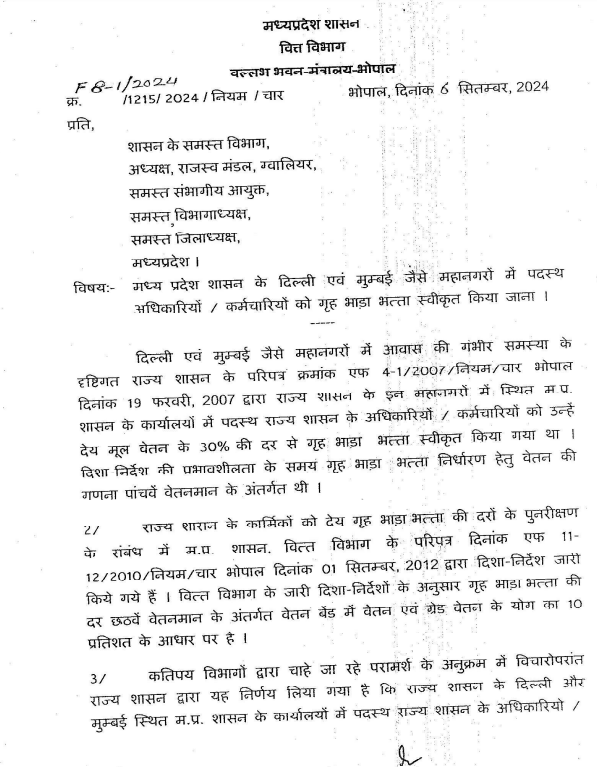 शब्बीर अहमद, भोपाल। मध्य प्रदेश के सरकारी अधिकारियों कर्मचारियों के लिए एक अच्छी खबर है। दरअसल, प्रदेश की डॉ मोहन यादव सरकार की सरकार ने गृह भाड़ा भत्ते (House Rent Allowance) में बढ़ोतरी की है। यह वृद्धि दिल्ली और मुंबई जैसे महानगरों में पदस्थ एमपी के अधिकारी-कर्मचारियों के भत्ते में की है। इस संबंध में वित्त विभाग ने आदेश जारी कर दिया है।