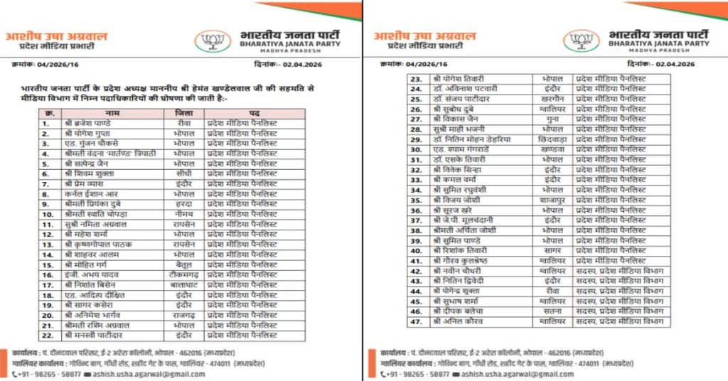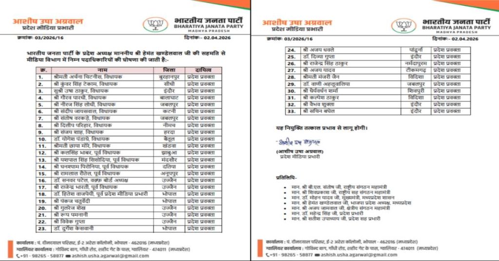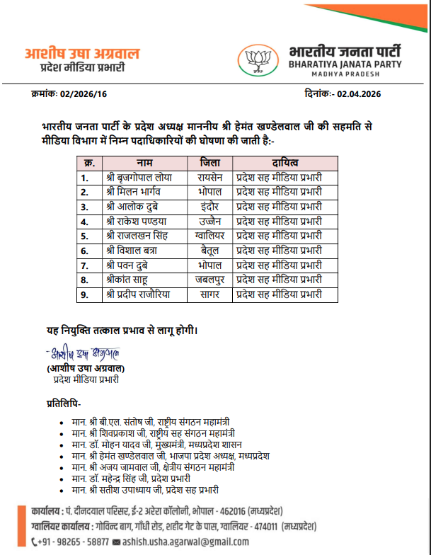 राकेश चतुर्वेदी, भोपाल। मध्य प्रदेश में भारतीय जनता पार्टी ने प्रवक्ताओं की सूची जारी कर दी है। जिसमें 33 प्रदेश प्रवक्ता बनाए गए है। इनमें 11 विधायकों को प्रदेश प्रवक्ता की जिम्मेदारी सौंपी गई है। 5 पूर्व विधायकों को भी स्थान मिला है। वहीं 9 सह मीडिया प्रभारी बनाए गए है। इसके अलावा 41 मीटिया पैनलिस्ट की भी नियुक्ति की गई है। इस संबंध में आदेश जारी हो गया है। यह नियुक्ति तत्काल प्रभाव से लागू होगी। आपको बता दें कि पार्टी का पक्ष रखने के लिए पहली बार इतनी बड़ी टीम उतारी गई है।