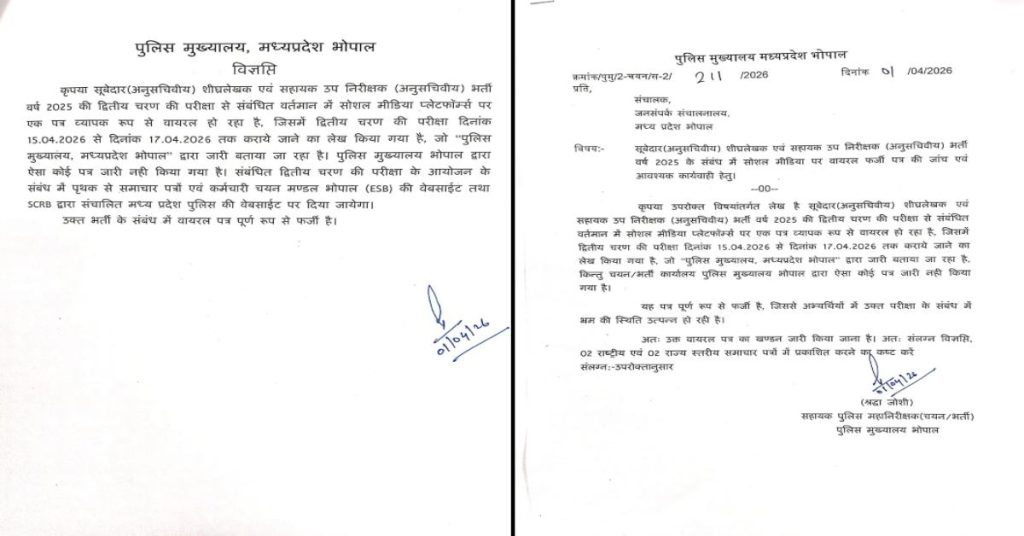 दरअसल, मध्यप्रदेश में सूबेदार, शीघ्रलेखक और सहायक उप निरीक्षक भर्ती 2025 की दूसरे चरण की परीक्षा को लेकर एक पत्र वायरल हो रहा था। जिसमें 15 अप्रैल 2026 से 17 अप्रैल 2026 तक दूसरे चरण की परीक्षा का दावा किया गया। पुलिस हेड क्वार्टर ने इसे लेकर एक आदेश जारी किया और इसे पूरी तरह से फर्जी-भ्रामक बताया हैं।