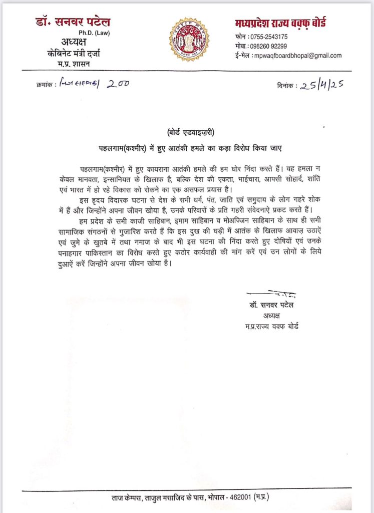 सनवर पटेल ने कहा कि इस हृदय विदारक घटना से देश के सभी धर्म, पंत, जाति एवं समुदाय के लोग गहरे शोक में हैं और जिन्होंने अपना जीवन खोया है, उनके परिवारों के प्रति गहरी संवेदनाएं प्रकट करते हैं। वहीं उन्होंने अपील करते हुए कहा कि मध्य प्रदेश के सभी काजी, इमाम और मुअज्जिन साहिबान के साथ ही सभी सामाजिक संगठनों से गुजारिश हैं कि इस दुख की घड़ी में आतंक के खिलाफ आवाज़ उठाने, जुमे के खुतबे में और नमाज के बाद भी इस घटना की निंदा करते हुए दोषियों और उनके पनाहगार पाकिस्तान का विरोध करते हुए कठोर कार्रवाई की मांग की अपील की है। साथ ही सनवर ने कहा कि उन लोगों के लिए दुआऐं करें जिन्होंने अपना जीवन खोया है।