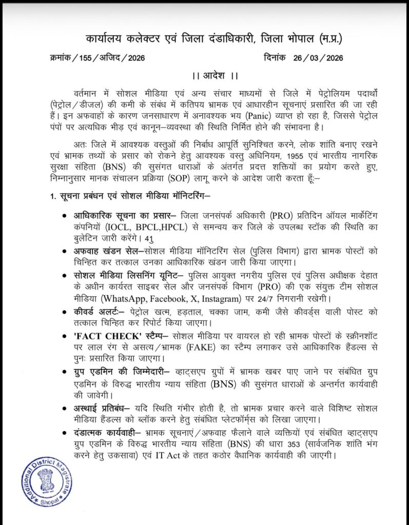 शब्बीर अहमद, भोपाल। मध्य प्रदेश की राजधानी भोपाल में पेट्रोल-डीजल की कमी की भ्रामक खबरे फैलाने वालों पर कड़ी कार्रवाई होगी। प्रशासन ने स्थिति को देखते हुए सख्त एसओपी लागू किया है। सोशल मीडिया पर 24×7 अफवाह फैलाने वालों पर निगरानी रखी जाएगी। व्हाट्सएप ग्रुप में गलत खबर शेयर करने पर एडमिन भी जिम्मेदार होंगे। वहीं पेट्रोल पंपों पर कालाबाजारी या ज्यादा दाम लेने पर तुरंत लाइसेंस रद्द होंगे।