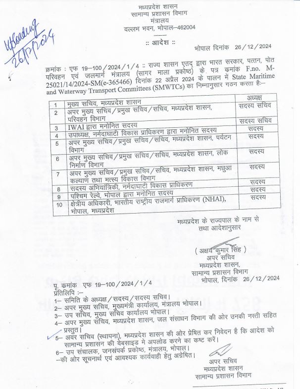 दरअसल, डॉ मोहन यादव की सरकार ने सागरमाला प्रोजेक्ट (Sagarmala Project) के तहत स्टेट मैरीटाइम और वाटर वे ट्रांसपोर्ट कमेटी का गठन किया है। एसएमडब्लूटीसी में मुख्य सचिव अध्यक्ष बने, एन एच ए आई, रेलवे और नर्मदा विकास प्राधिकरण के अधिकारी को भी शामिल किया गया है।