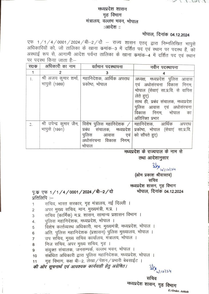 शब्बीर अहमद, भोपाल। मध्य प्रदेश में पुलिस अधिकारियों का तबादला किया गया है। अजय कुमार शर्मा को एमपी पुलिस हाउसिंग कॉरपोरेशन का अध्यक्ष बनाया गया है। इससे पहले वे आर्थिक अपराध प्रकोष्ठ में पदस्थ थे। वहीं उपेंद्र जैन को आर्थिक अपराध प्रकोष्ठ के नए डीजी की जिम्मेदारी सौंपी गई है। कैलाश मकवाना के डीजीपी बनने के बाद पुलिस हाउंसिंग कॉर्पोरेशन के अध्यक्ष का पद खाली था। इस संबंध में पुलिस विभाग ने आदेश जारी कर दिया है।