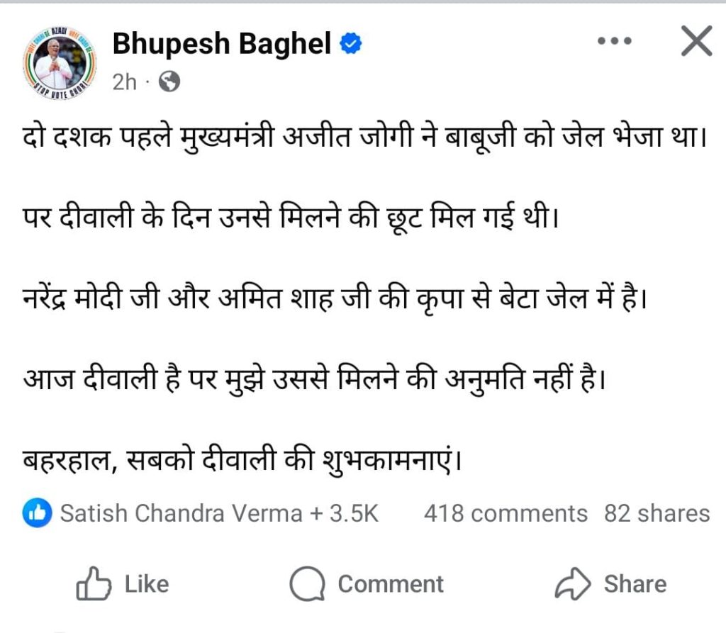 रायपुर। आज पूरा देश दीपावली मना रहा। इस बीच छत्तीसगढ़ के पूर्व मुख्यमंत्री भूपेश बघेल ने एक भावनात्मक ट्वीट किया है. उन्होंने सोशल साइट एक्स पर लिखा- दिवाली पर मुझे जेल में बंद अपने बेटे चैतन्य बघेल से मिलने की अनुमति नहीं मिली. दो दशक पहले मुख्यमंत्री अजीत जोगी ने बाबूजी को जेल भेजा था, पर दीवाली के दिन उनसे मिलने की छूट मिल गई थी.