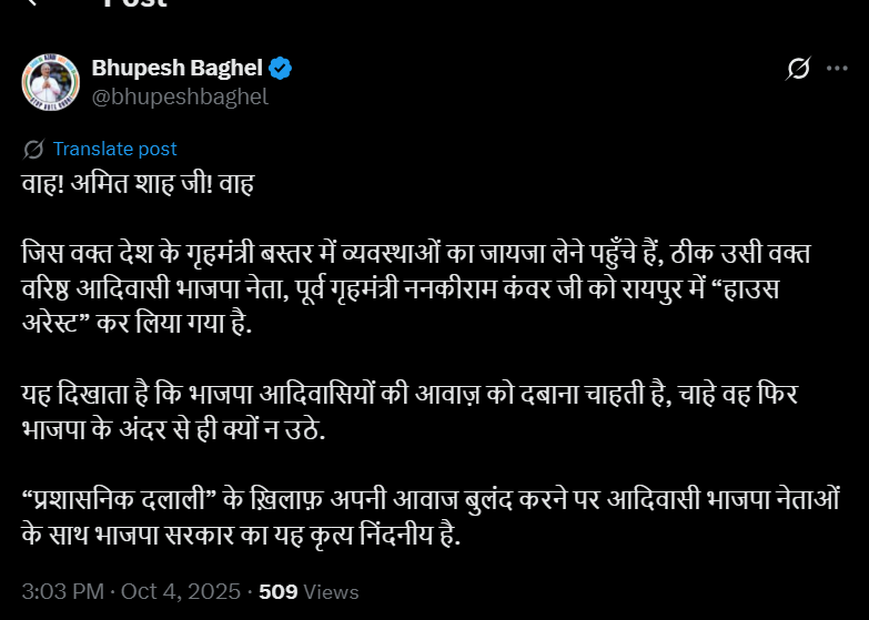 बघेल तंज कसते हुए सोशल मीडिया पर लिखा- “वाह! अमित शाह जी! वाह” जिस वक्त देश के गृहमंत्री बस्तर में व्यवस्थाओं का जायजा लेने पहुँचे हैं, ठीक उसी वक्त वरिष्ठ आदिवासी भाजपा नेता, पूर्व गृहमंत्री ननकीराम कंवर को रायपुर में हाउस अरेस्ट कर लिया गया है. यह दिखाता है कि भाजपा आदिवासियों की आवाज़ को दबाना चाहती है, चाहे वह फिर भाजपा के अंदर से ही क्यों न उठे. “प्रशासनिक दलाली” के ख़िलाफ़ अपनी आवाज बुलंद करने पर आदिवासी भाजपा नेताओं के साथ भाजपा सरकार का यह कृत्य निंदनीय है.