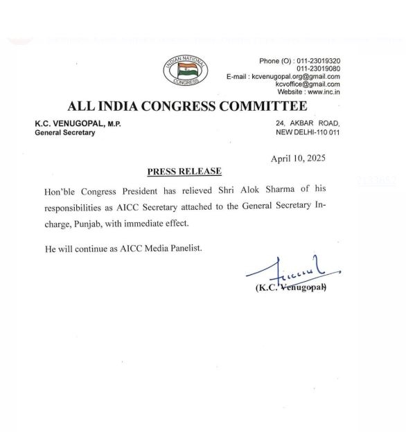 कांग्रेस अध्यक्ष ने आलोक शर्मा को पंजाब प्रभारी महासचिव से संबद्ध एआईसीसी सचिव के रूप में उनकी जिम्मेदारियों से तत्काल प्रभाव से मुक्त कर दिया है। वह एआईसीसी मीडिया पैनलिस्ट के रूप में अपना कार्य जारी रखेंगे। दरअसल आल इंडिया कांग्रेस कमेटी की तरफ से इस संबंध में एक पत्र जारी करते हुए आलोक शर्मा को एआईसीसी सचिव पद से हटा दिया गया है। शर्मा को उनकी जिम्मेदारियों से तत्काल प्रभाव से मुक्त कर दिया है।