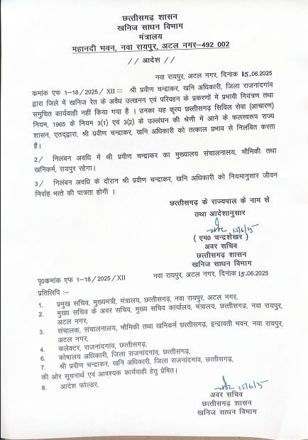 जारी आदेश के अनुसार, यह कार्रवाई छत्तीसगढ़ सिविल सेवा (आचरण) नियम 1965 के तहत की गई है। निलंबन अवधि के दौरान प्रवीण चंद्राकर का मुख्यालय संचालनालय, भौमिकी तथा खनिकर्म, रायपुर निर्धारित किया गया है, तथा उन्हें नियमानुसार जीवन निर्वाह भत्ता मिलेगा।