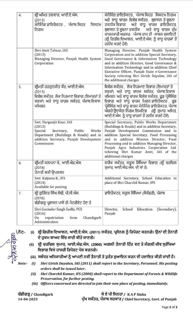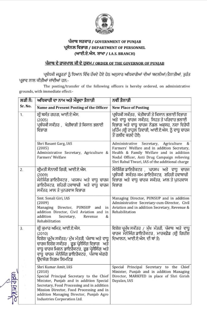 पंजाब में फेरबदल का दौर लगातार जारी है। एक बार फिर पंजाब सरकार ने प्रशासनिक स्तर पर बड़ा फेरबदल किया है। जारी आदेश के अनुसार 5 IAS, एक IFS सहित एक PCS अधिकारियों के तबादले शामिल हैं। इसके पहले भी शुक्रवार के दिन तीन IPS अफसरों का तबादला हुआ था।