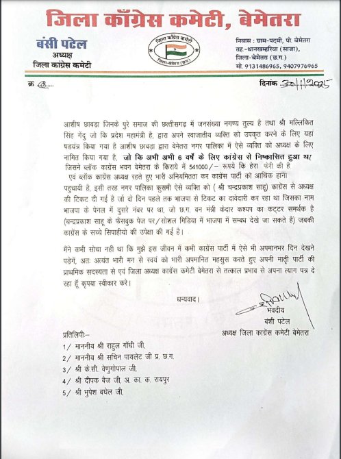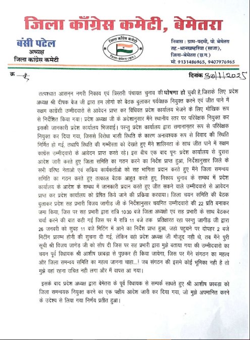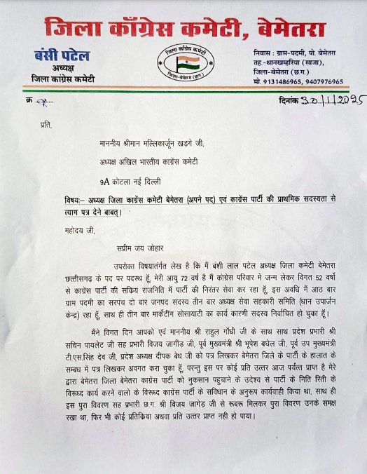 बंशी पटेल ने अपने इस्तीफा पत्र में कहा कि उन्होंने पिछले 52 वर्षों में कांग्रेस पार्टी की सेवा की और कई बार विभिन्न पदों पर कार्य किया है, लेकिन हाल के दिनों में पार्टी के अंदर हो रहे विवाद और निर्णयों से वह आहत हैं. उन्होंने पत्र में प्रदेश अध्यक्ष दीपक बैज और अन्य नेताओं से बेमेतरा जिले की स्थिति के बारे में शिकायत की थी, लेकिन कोई सकारात्मक प्रतिक्रिया नहीं मिली.