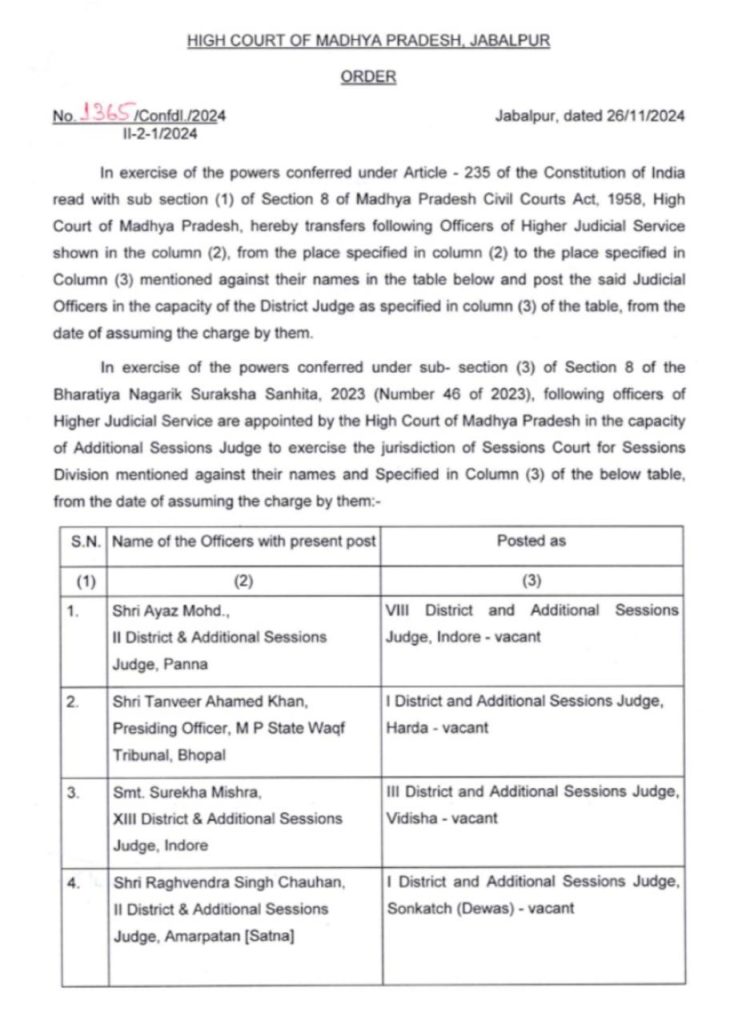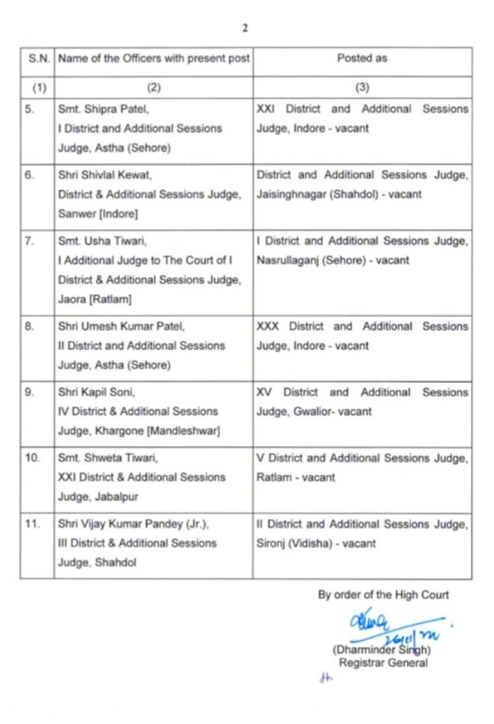मध्यप्रदेश हाईकोर्ट के द्वारा ट्रांसफर ऑर्डर जारी किए गए। इनमें 11 जिला और अतिरिक्त सत्र न्यायाधीश शामिल है। प्रदेश के इंदौर, हरदा, विदिशा, देवास, जयसिंहनगर, ग्वालियर, रतलाम और सिरोंज जिले में स्थानांतरण किया गया है।