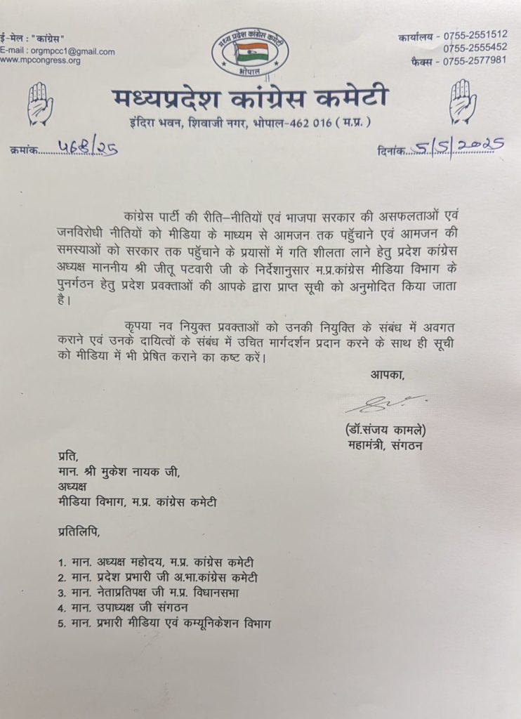 सुधीर दंडोतिया, भोपाल। मध्यप्रदेश कांग्रेस कमेटी के मीडिया विभाग में बड़ा बदलाव हुआ है। मीडिया विभाग के प्रदेश अध्यक्ष मुकेश नायक ने 53 प्रवक्ताओं की लिस्ट जारी की है। सूची में देखें किसे किसे जिम्मेदारी मिली है। इस आशय का आदेश महामंत्री संगठन डॉ संजय कामले के हस्ताक्षर से जारी हुआ है। पत्र प्रदेश अध्यक्ष जीतू पटवारी के नाम जारी हुआ है। आदेश की प्रतिलिपि प्रदेश मीडिया विभाग के अध्यक्ष मुकेश नायक को भी भेजी गई है।
