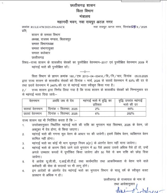 जारी आदेश के मुताबिक, सातवें वेतनमान वाले कर्मचारियों को 1 सितंबर 2025 से 55% महंगाई भत्ता मिलेगा। वहीं छठवें वेतनमान वाले कर्मचारियों का डीए 6% बढ़कर 252% हो जाएगा।
