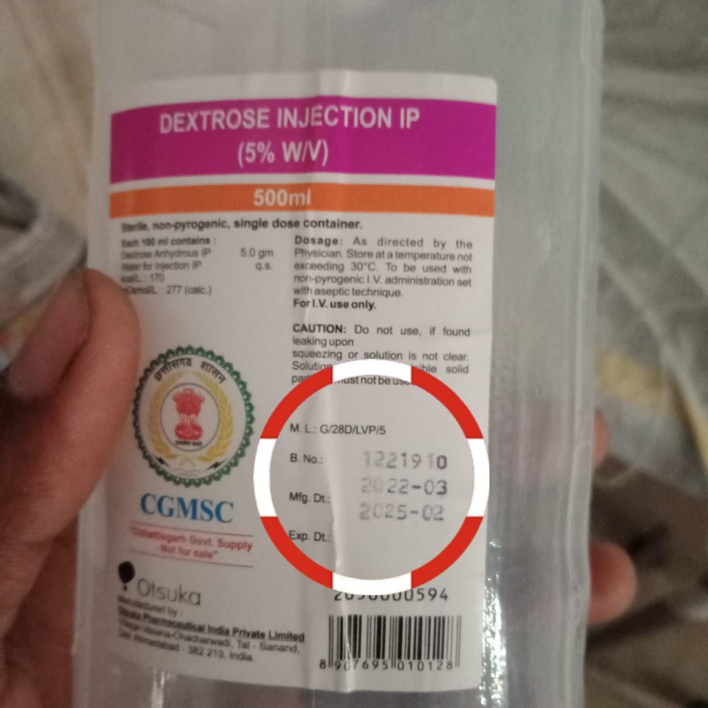 जिस डिप को दीपक को लगाया गया उसका बैच नंबर 1221910 था. यह दवा सीजी-एमएससी (CGMSC) से दुर्ग जिले को सप्लाई हुई है. मार्च 2022 में बनी इस दवा की एक्सपायरी डेट फरवरी 2025 प्रिंट की गई है, लेकिन इसके बावजूद इसे सुपेला अस्पताल में रखा गया और मरीजों को चढ़ाया जा रहा है.