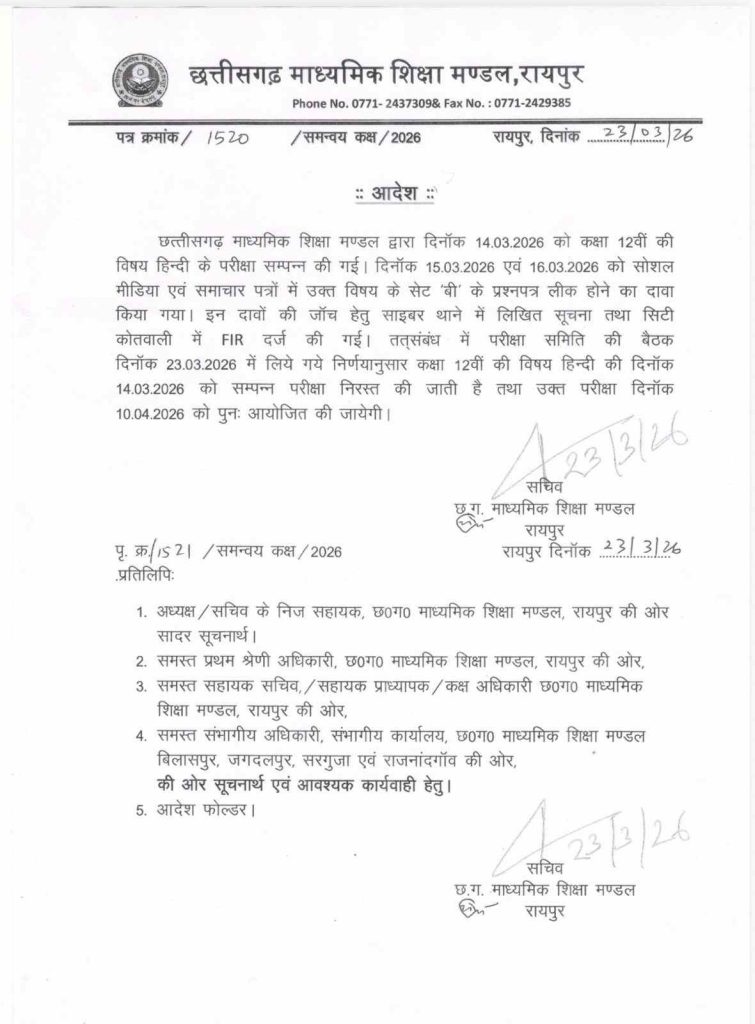 सत्या राजपूत, रायपुर। छत्तीसगढ़ में 12वीं बोर्ड का हिंदी पेपर लीक होने के दावों के बाद माध्यमिक शिक्षा मंडल ने हिंदी पेपर को निरस्त कर दिया है। बता दें कि कक्षा 12वीं का हिंदी पेपर 14 मार्च 2026 को हुआ था। अब फिर से 10 अप्रैल 2026 को हिंदी की परीक्षा आयोजित की जाएगी। इसका आदेश माध्यमिक शिक्षा मंडल ने जारी कर दिया है।