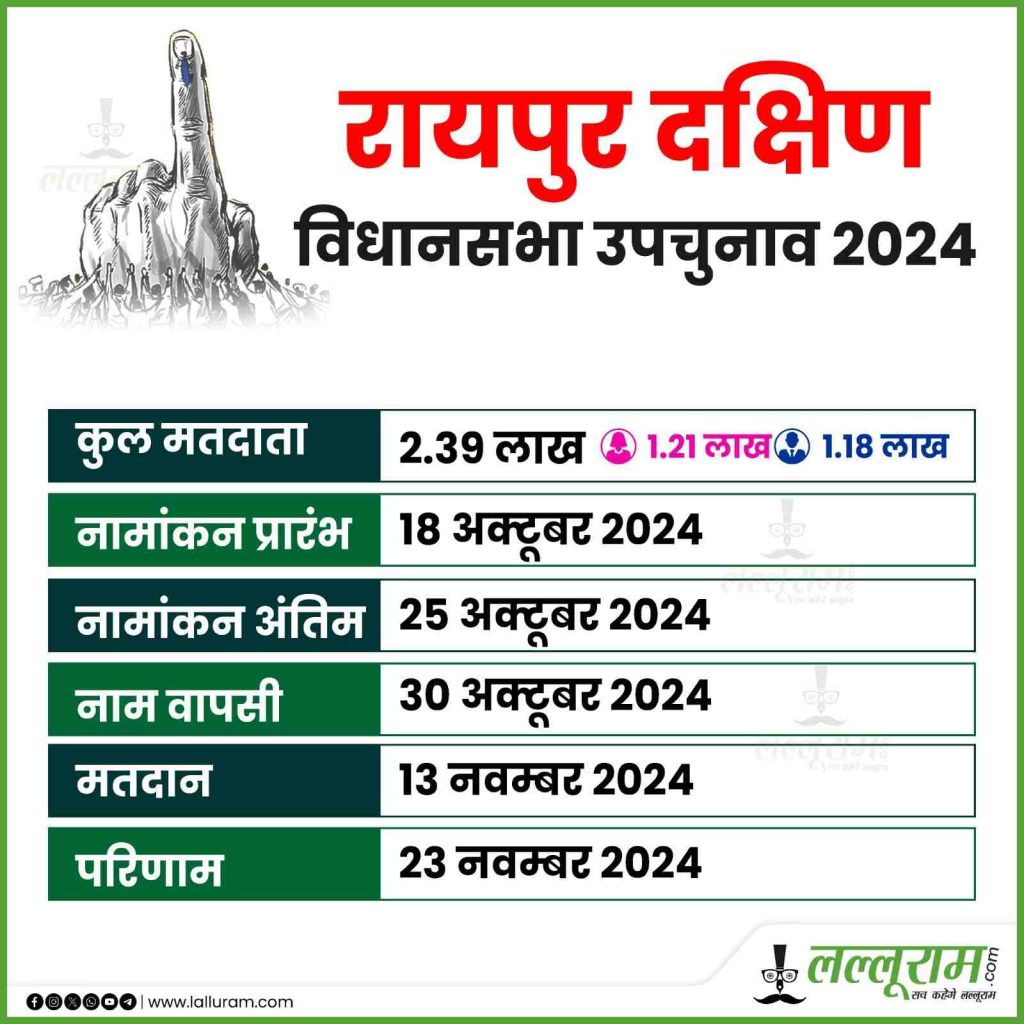 चुनाव आयोग के मुताबिक, नामांकन की अंतिम तिथि 25 अक्टूबर होगी. 28 अक्टूबर को नामांकन पत्रों की स्क्रूटनी होगी. वहीं नामांकन वापसी की अंतिम तिथि 30 अक्टूबर है. बता दें कि लोकसभा चुनाव में इस बार मंत्री बृजमोहन अग्रवाल को रायपुर लोकसभा से टिकट दी गई थी. रायपुर से उन्होंने ऐतिहासिक जीत दर्ज की. उनकी जीत के बाद रायपुर दक्षिण एक मात्र ऐसी सीट है, जहां उपचुनाव होंगे.