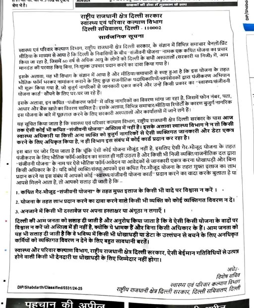 दिल्ली में महिला सम्मान योजना और संजीवनी योजना को लेकर बड़ी खबर. दिल्ली स्वास्थ्य विभाग ने संजीवनी और महिला सम्मान योजना को लेकर एक नोटिस जारी किया है. जिसमें कहा गया कि, लोग इन तरह की योजनाओं के बहकावे में न आएं. रजिस्ट्रेशन कर लोगों को गुमराह किया जा रहा है. महिला एवं बाल विकास विभाग ने एक विज्ञापन जारी किया है जिसमें लोगों से कहा गया है कि वे अपनी जानकारी साझा करने से बचें; दूसरा नोटिफिकेशन स्वास्थ्य एवं परिवार कल्याण विभाग ने जारी किया है.