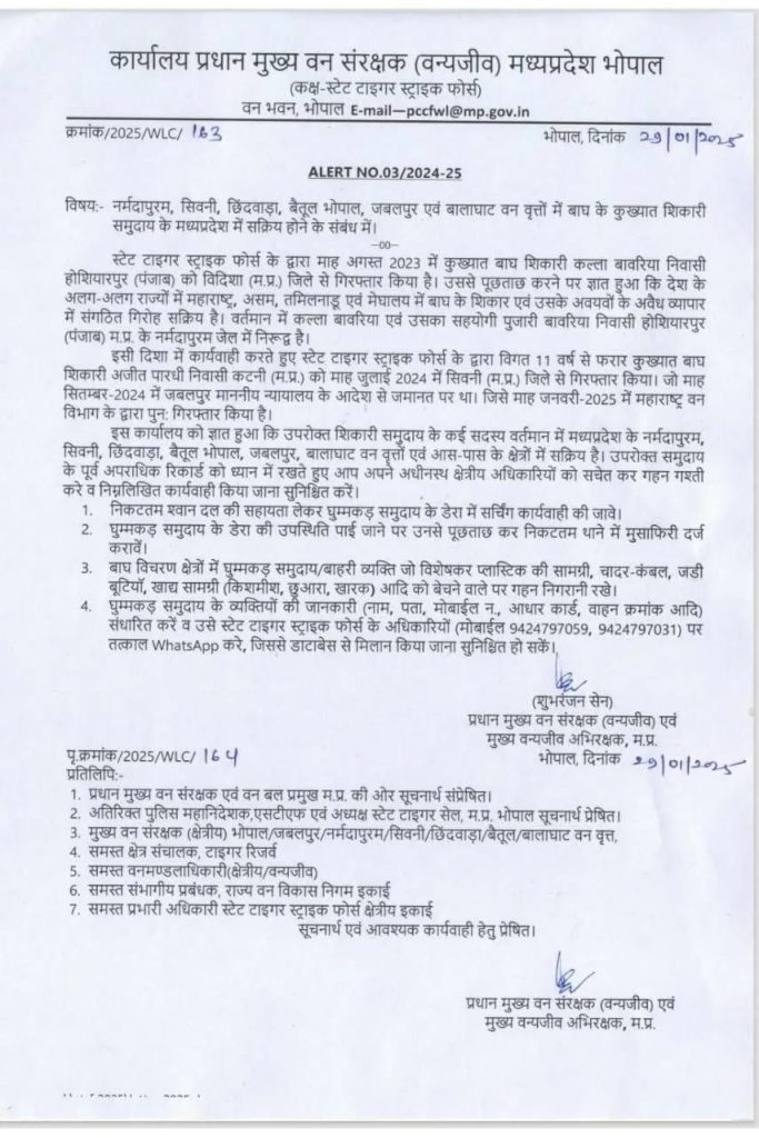 दरअसल पंजाब के कुख्यात शिकारी कल्ला बावरिया से पूछताछ के आधार पर वन विभाग ने प्रदेश भर में यह हाईअलर्ट जारी किया है। मध्यप्रदेश के बाघों को दूसरे राज्यों के शिकारियों से ज्यादा खतरा है। प्रदेश के नर्मदापुरम, छिंदवाड़ा, बैतूल, भोपाल, जबलपुर और बालाघाट के जंगलों में बाघ के कुख्यात शिकारी सक्रिय है। महाराष्ट्र, असम, तमिलनाडु और मेघालय के अवैध व्यापार करने वाला संगठित गैंग मौजूद है। जंगलों में घुमंतु जनजाति के समूह के बीच शिकारियों के मौजूद होने की आशंका है।