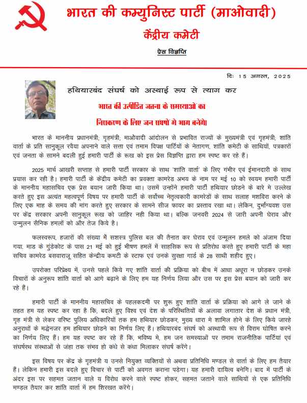 नक्सलियों की केंद्रीय कमेटी के प्रवक्ता अभय की ओर से जारी पत्र में कहा गया है कि 2025 मार्च आखरी सप्ताह से हमारी पार्टी सरकार के साथ ‘शांति वार्ता’ के लिए गंभीर एवं ईमानदारी के साथ प्रयास कर रही है. हमारी पार्टी के केंद्रीय कमेटी का प्रवक्ता कामरेड अभय के नाम पर मई 10 को स्वयम हमारी पार्टी के महासचिव एक प्रेस बयान जारी किया था. उसमें उन्होंने हमारी पार्टी हथियार छोड़ने के बारे में उल्लेख करते हुए इस अत्यंत महत्वपूर्ण विषय पर हमारी पार्टी के सर्वोच्च नेतृत्वकारी कामरेडों के साथ सलाह मशविरा करने के लिए एक माह के समय की मांग करते हुए सरकार के सामने सीज फायर का प्रस्ताव रखा था, लेकिन दुर्भाग्यवश उस पर केंद्र सरकार अपनी सानुकूल रूख को जाहिर नहीं किया था, बल्कि जनवरी 2024 से जारी अपनी घेराव और उन्मुलन सैनिक हमलों को और तेज किए हैं.