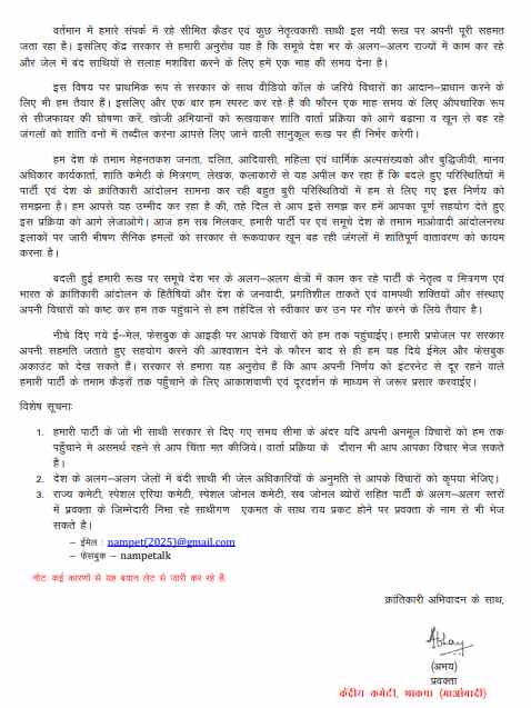 पत्र में आगे कहा गया है कि हजारों की संख्या में सशस्त्र पुलिस बल तैनात कर घेराव एवं उन्मूलन हमले को अंजाम दिया गया. माड के गुंडेकोट के पास 21 मई को हुए भीषण हमले में साहसिक रूप से प्रतिरोध करते हुए हमारी पार्टी के महासचिव कामरेड बसवाराजू सहित केंद्रीय कमटी के स्टाफ एवं उनके सुरक्षा गार्ड के 28 साथी शहीद हुए. इस परिप्रेक्ष्य में उनसे पहले किए गए शांति वार्ता की प्रक्रिया को बीच में आधा अधूरा न छोड़कर उनके विचारों के अनुरूप शांति वार्ता को आगे बढ़ाने के लिए हमनें यह निर्णय लिया है.