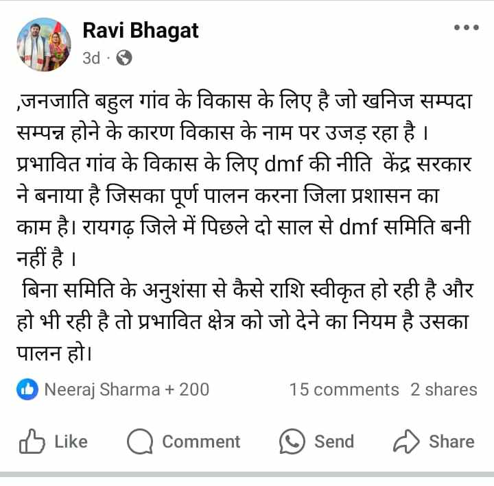 बता दें कि पिछले दिनों भाजयुमो प्रदेश अध्यक्ष रवि भगत ने DMF पैसा जारी नहीं करने को लेकर सोशल मीडिया में वीडियो पोस्ट किया था. उन्होंने अपील की थी कि डीएमएफ की राशि गांव में ही खर्च करने के लिए सरकार को पहल करनी चाहिए, चूंकि सड़क, जल सहित अन्य कई विकास कार्य है, जो इस राशि से काफी हद तक पूरे हो सकते हैं. इस पोस्ट को लेकर वित्त मंत्री ओपी चौधरी ने भी पत्रकारों के सवाल पर कहा था कि नियमानुसार जिस जगह डीएमएफ की राशि खर्च करने की आवश्यकता होती है वहां बकायदा काम हो रहे हैं और उन्होंने इसे एक सामान्य मांग बताया था.