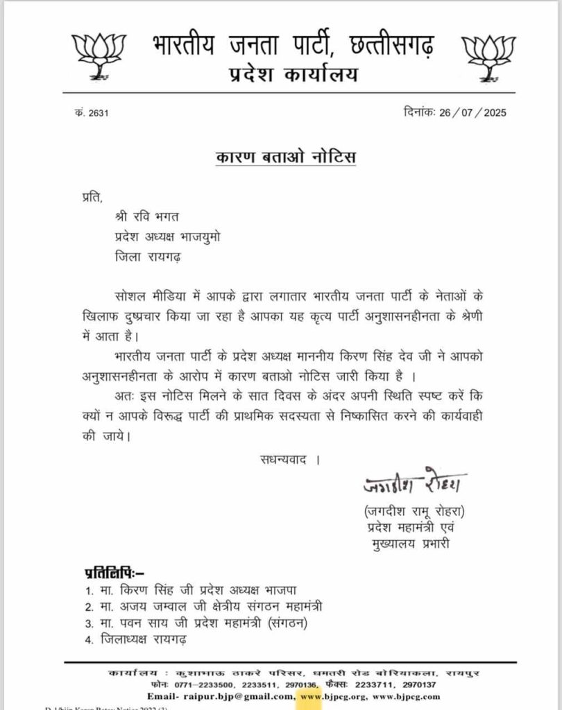 रायपुर. बीजेपी नेताओं के खिलाफ दुष्प्रचार करने के मामले में भाजपा प्रदेश अध्यक्ष किरण सिंहदेव ने भाजयुमो के प्रदेश अध्यक्ष रवि भगत को कारण बताओ नोटिस जारी किया है. प्रदेश अध्यक्ष ने 7 दिन के अंदर जवाब मांगा है. जवाब नहीं देने पर पार्टी से निष्कासन की कार्यवाही हो सकती है.