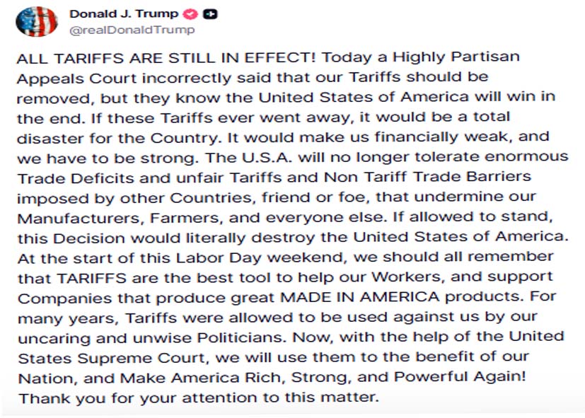 राष्ट्रपति ट्रंप ने सोशल मीडिया प्लेटफॉर्म ट्रुथ सोशल पर लिखा कि “सभी टैरिफ अभी भी लागू हैं. आज एक बेहद पक्षपातपूर्ण अपील अदालत ने गलत तरीके से कहा कि हमारे टैरिफ हटा दिए जाने चाहिए, लेकिन अंत में जीत अमेरिका की ही होगी. अगर ये टैरिफ हट भी गए, तो यह देश के लिए एक बड़ी आपदा होगी.”