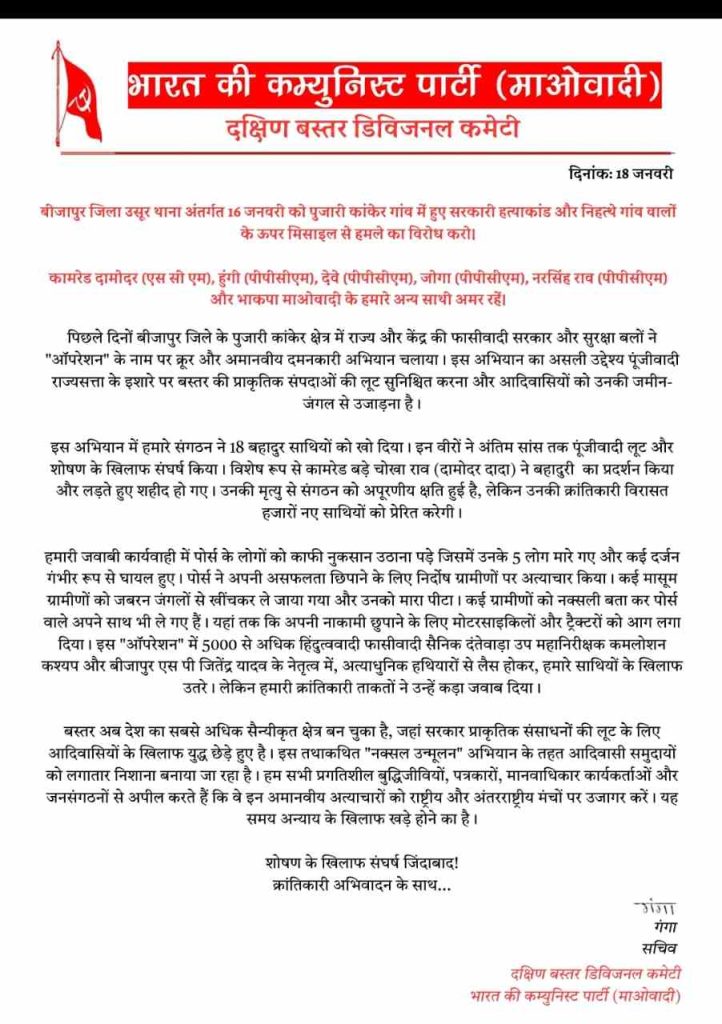 नक्सली संगठन की ओर से जारी प्रेस नोट