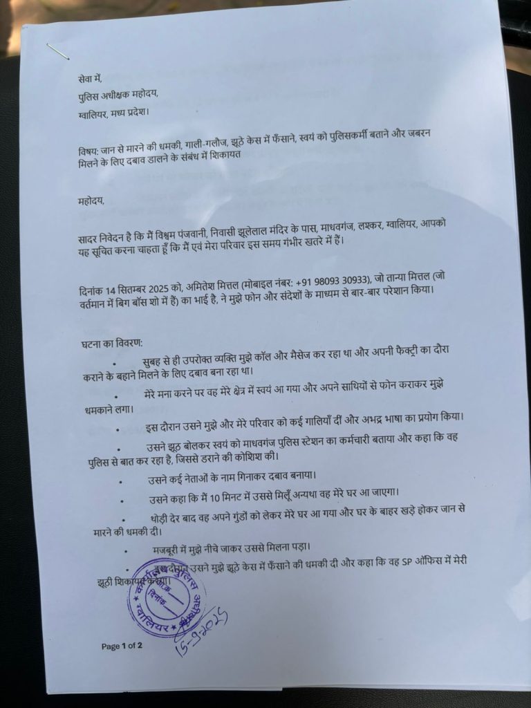 कर्ण मिश्रा,ग्वालियर। फेमस रियलिटी शो बिग बॉस फेम तान्या मित्तल और उनके भाई पर बड़ा आरोप लगा हैं। सोशल मीडिया इंफ्लुएंसर विश्वम पंजवानी ने यह आरोप लगाया है। ग्वालियर निवासी पंजवानी ने तान्या मित्तल और उनके भाई अमृतेश से जान को खतरा बताते हुए, कुछ भी अनहोनी होने पर दोनों को जिम्मेदारी बताया है। पंजवानी ने तान्या के भाई पर फोन के साथ घर आकर धमकाने का आरोप लगाया है। कुछ वीडियो भी उन्होंने जारी किए है।