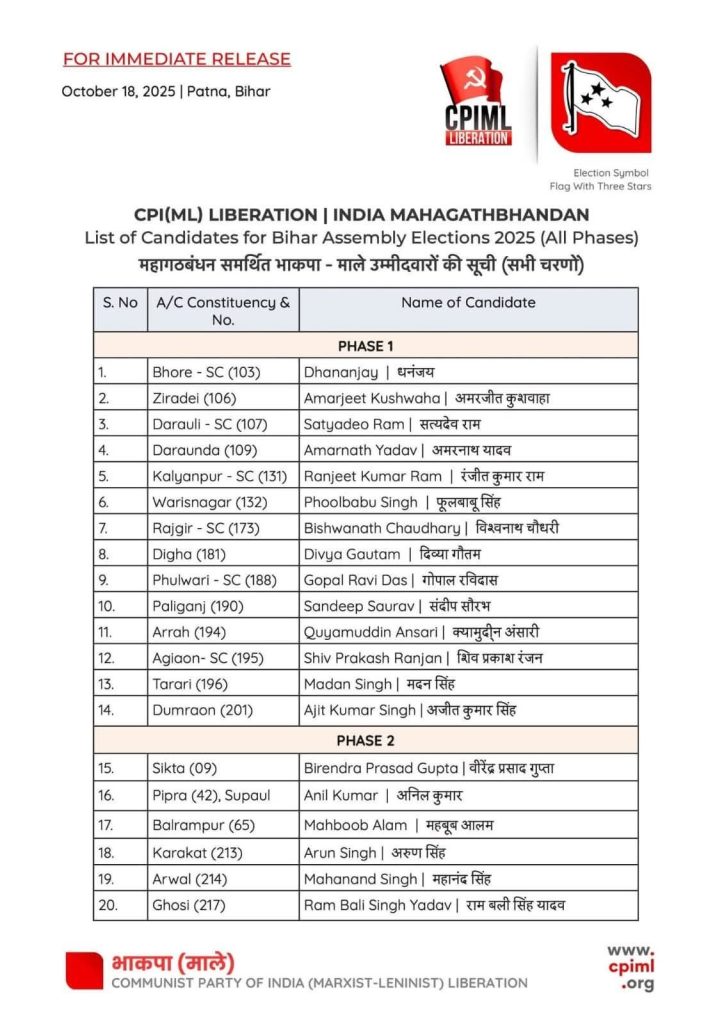 पटना। बिहार विधानसभा चुनाव 2025 के लिए भारतीय कम्युनिस्ट पार्टी (माले) ने अपने 20 उम्मीदवारों की सूची जारी कर दी है। पार्टी ने पहले और दूसरे दोनों चरणों की सीटों के लिए एक साथ नामों की घोषणा की है। इन सीटों में अनुसूचित जाति और सामान्य वर्ग दोनों को प्रतिनिधित्व दिया गया है। भाकपा-माले राज्य में महागठबंधन का हिस्सा है और राजद व कांग्रेस के साथ मिलकर चुनाव लड़ रही है।