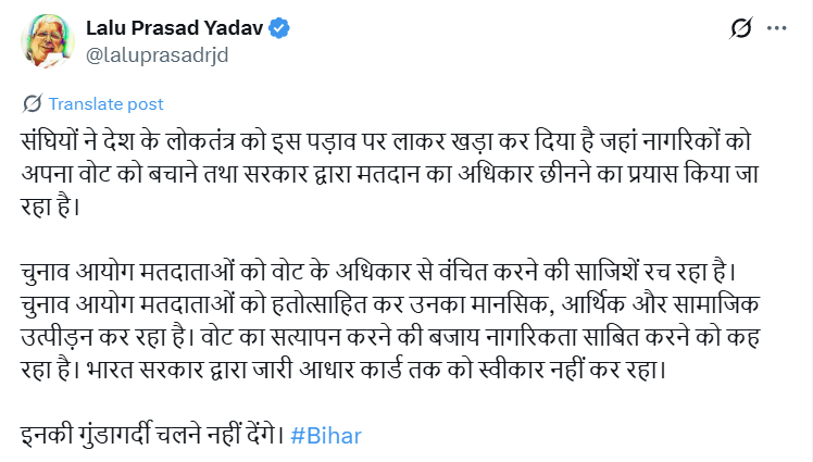 दरअसल, मतदाता सूची के विशेष गहन पुनरीक्षण प्रक्रिया को लेकर लालू यादव ने X पर एक पोस्ट किया है. लालू यादव ने पोस्ट में लिखा- संघियों ने देश के लोकतंत्र को इस पड़ाव पर लाकर खड़ा कर दिया है, जहां नागरिकों को अपना वोट को बचाने तथा सरकार द्वारा मतदान का अधिकार छीनने का प्रयास किया जा रहा है.”