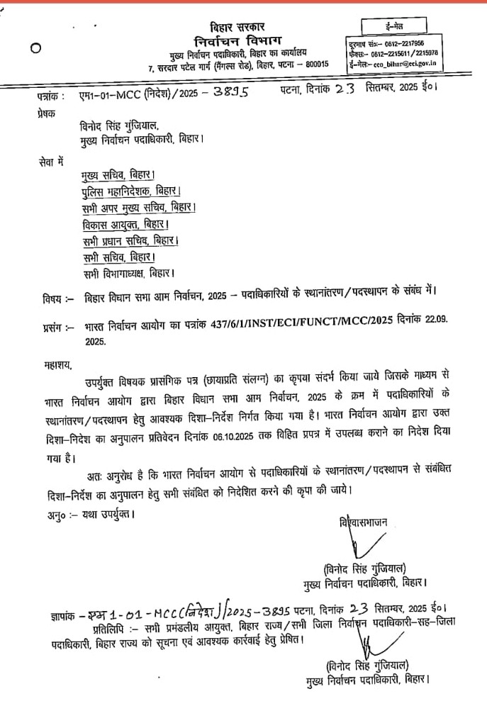 पटना। बिहार में विधानसभा चुनाव की तैयारी ने रफ्तार पकड़ ली है। चुनाव की घोषणा कभी भी हो सकती है। इसी बीच निर्वाचन आयोग ने राज्य सरकार को बड़ा निर्देश जारी किया है। आयोग ने मुख्य सचिव, डीजीपी, विकास आयुक्त और सभी प्रधान सचिवों को पत्र भेजकर कहा है कि राज्य में अधिकारियों और कर्मचारियों के तबादले की प्रक्रिया 6 अक्टूबर तक हर हाल में पूरी कर ली जाए। निर्वाचन आयोग का मानना है कि निष्पक्ष चुनाव के लिए प्रशासनिक अमले में बदलाव बेहद जरूरी है। निर्देश के अनुसार जिन अधिकारियों या कर्मचारियों का कार्यकाल 30 नवंबर 2025 तक तीन साल पूरा हो रहा है उनका ट्रांसफर अनिवार्य होगा। साथ ही किसी भी अधिकारी को उनके गृह जिले में पोस्टिंग नहीं दी जाएगी ताकि चुनावी प्रक्रिया में कोई पक्षपात न हो।