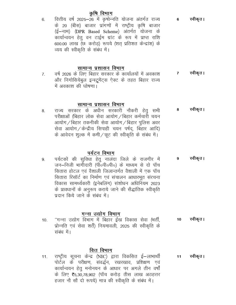 बैठक में गन्ना उद्योग विभाग में “बिहार ईख विकास सेवा (भर्ती, प्रोन्नति एवं सेवा शर्तें) नियमावली, 2025” को स्वीकृति प्रदान की गई। इससे गन्ना किसानों और उद्योग से जुड़े कर्मियों को लाभ मिलने की उम्मीद है। कैबिनेट के इन सभी फैसलों से स्पष्ट है कि सरकार शिक्षा, रोजगार, पर्यटन, कृषि और सामाजिक सरोकारों पर फोकस कर रही है। इन निर्णयों के अमल में आने से राज्य की दिशा और दशा दोनों में सकारात्मक बदलाव देखने को मिल सकता है।
