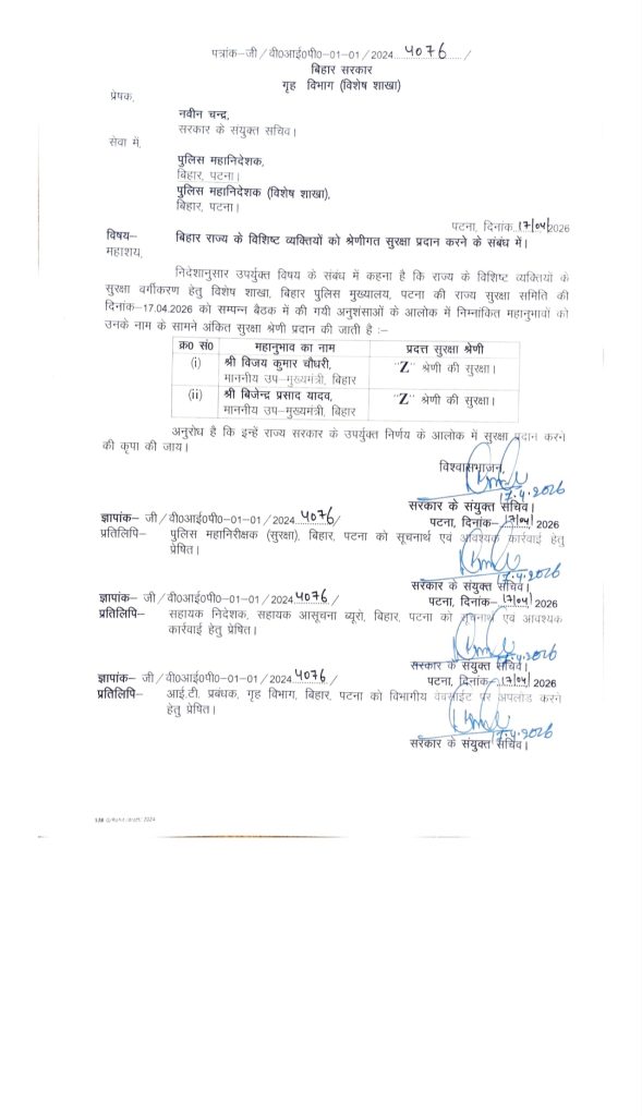 कुंदन कुमार/ पटना। बिहार सरकार ने राज्य के दोनों नवनियुक्त उपमुख्यमंत्री, विजय कुमार चौधरी और विजेंद्र प्रसाद यादव, की सुरक्षा व्यवस्था को लेकर एक बेहद महत्वपूर्ण और बड़ा निर्णय लिया है। प्रशासन ने सुरक्षा के स्तर को बढ़ाते हुए अब दोनों नेताओं को Z+ (Z Plus) श्रेणी की सुरक्षा प्रदान करने का फैसला किया है।