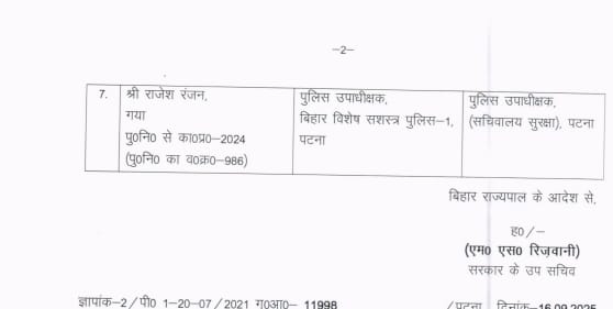 - ऋषव शिव रंजन जो अब तक ट्रैफिक डीएसपी नवादा थे उन्हें विशेष सुरक्षा दल पटना में स्थानांतरित किया गया है।